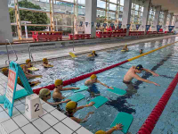 初心者・初級コースは、・呼吸法から始まり、基本的なバタ足、ビート板を使った