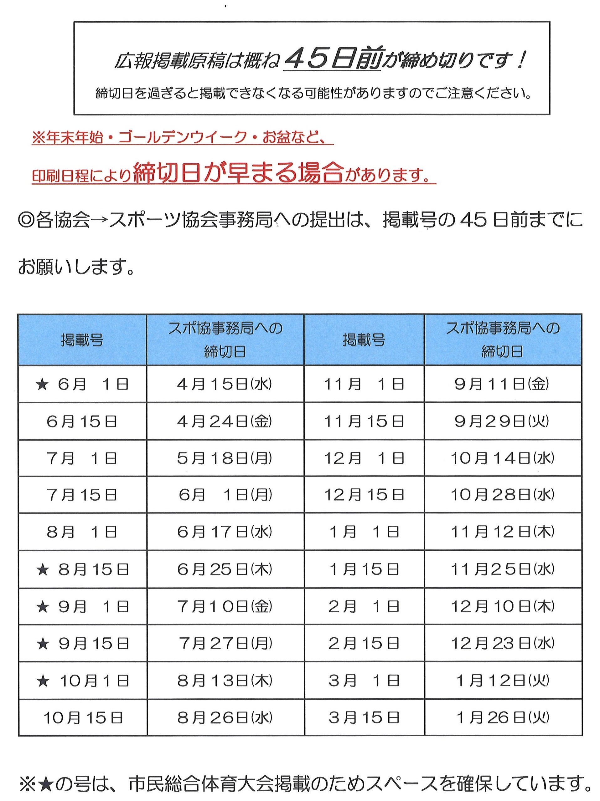 習志野市スポーツ協会加盟規則第2条(報告及び届け出義務)により加盟団体は、下記の書類を期限までに事務局へご提出ください。